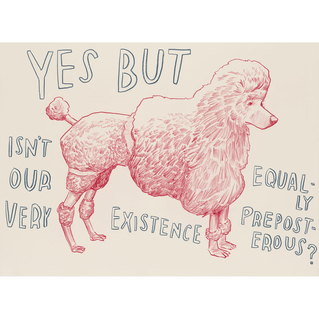 It Is Right to Draw Their Fur echoes questions posed by Eggers: What is the line between a doodle, a cartoon, a gag, and a work of fine art? Does it seem, sometimes, that the artist is defacing his or her own work by adding text? Is loose draftsmanship appealing, in that it's intimate and disarming? Is absurdity more appealing when it comes across as humble?